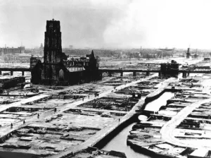 Het hart van Rotterdam werd op 14 mei 1940 door de Duitsers gebombardeerd en daarbij vrijwel volledig vernietigd. Bij het bombardement kwamen ongeveer 850 mensen om het leven en werden zeker 25.000 woningen en 11.000 andere panden vernietigd.