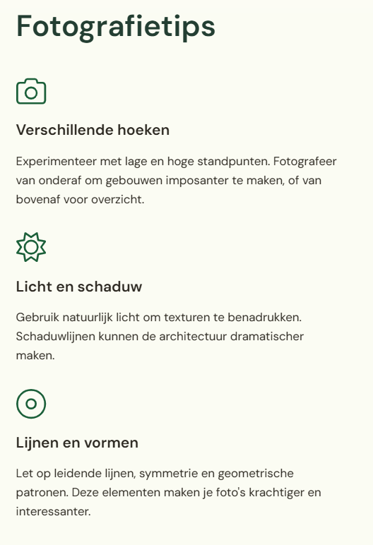 - Let op hoe je de foto maakt: verschillende hoeken, licht en schaduw, lijnen en vormen.
